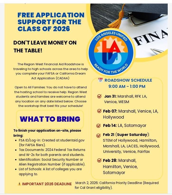 FAFSA / CADAA Workshop Saturday, 2-14-2026, 9 AM - 1 PM (CLASS OF 2026) Published February 12, 2026 Print