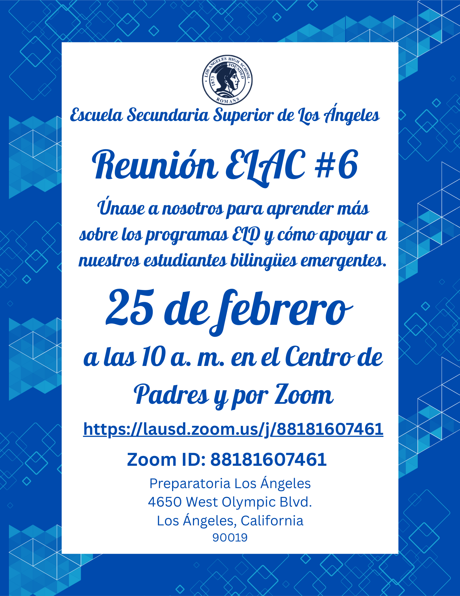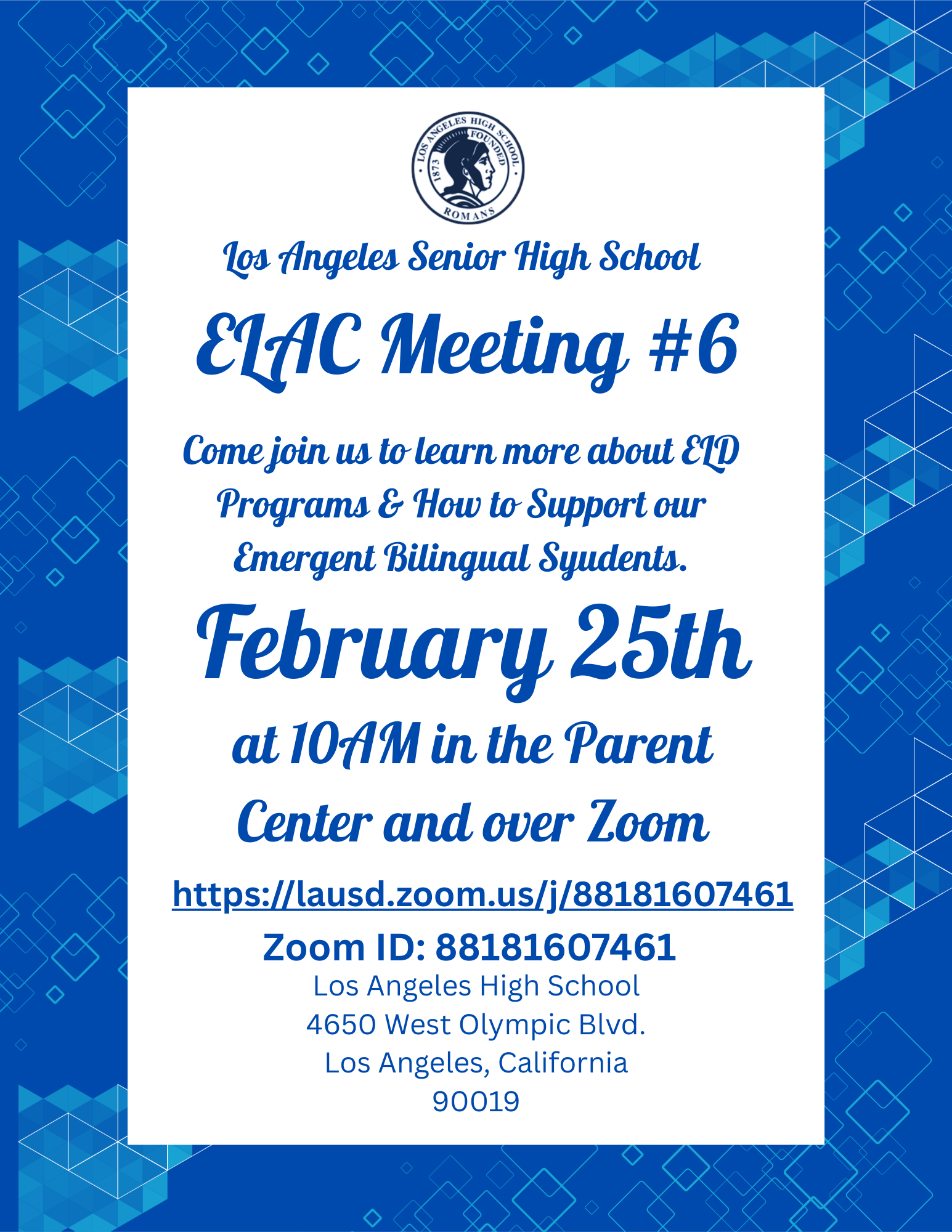 ELAC MEETING #6 02-25-2026 10:00AM @ Parent Center and Zoom https://lausd.zoom.us/j/88181607461Zoom ID: 88181607461 Published February 24, 2026 Print