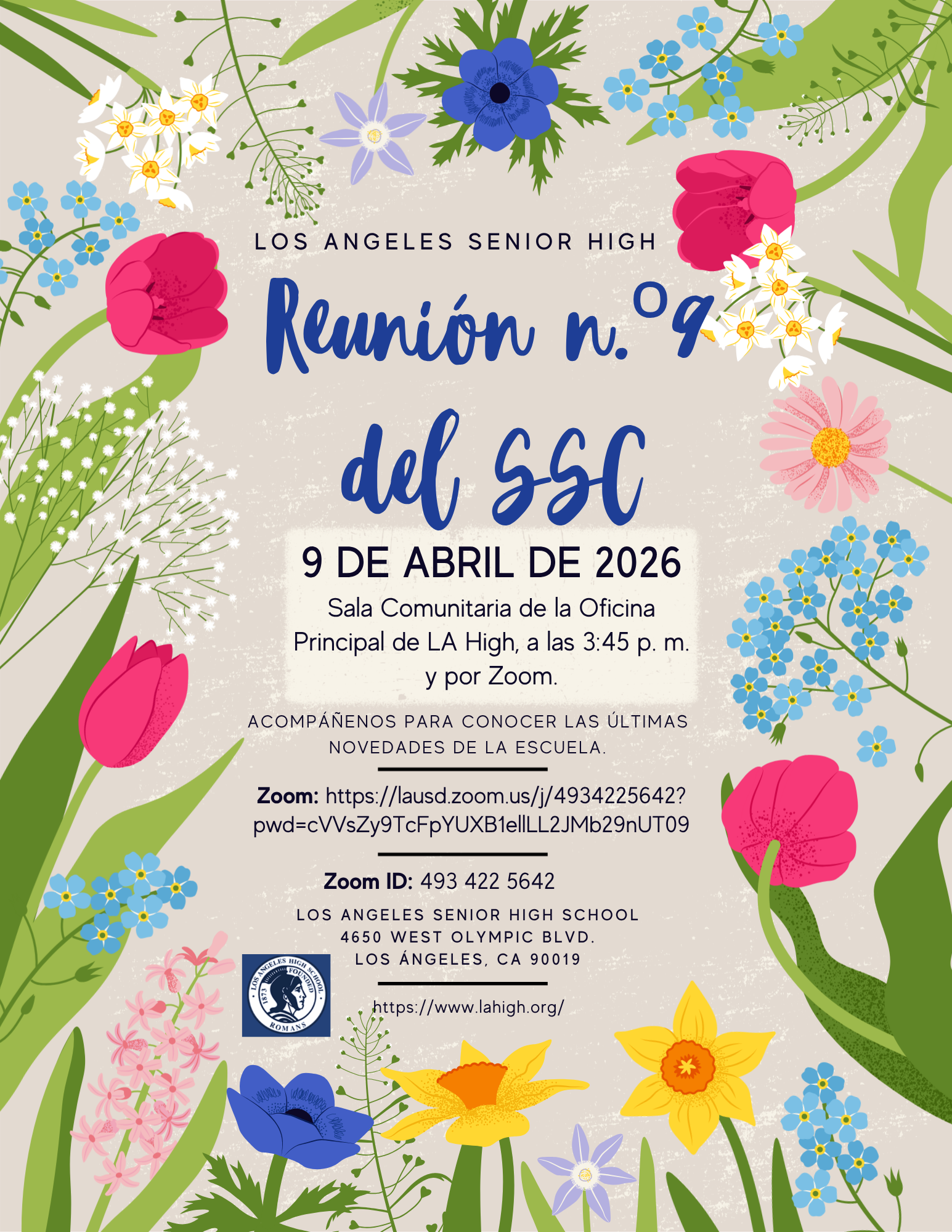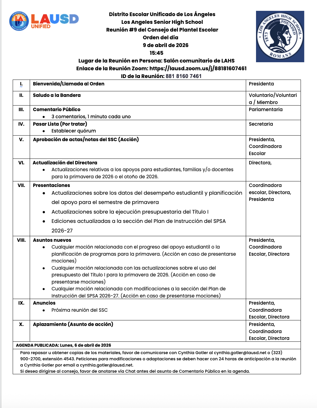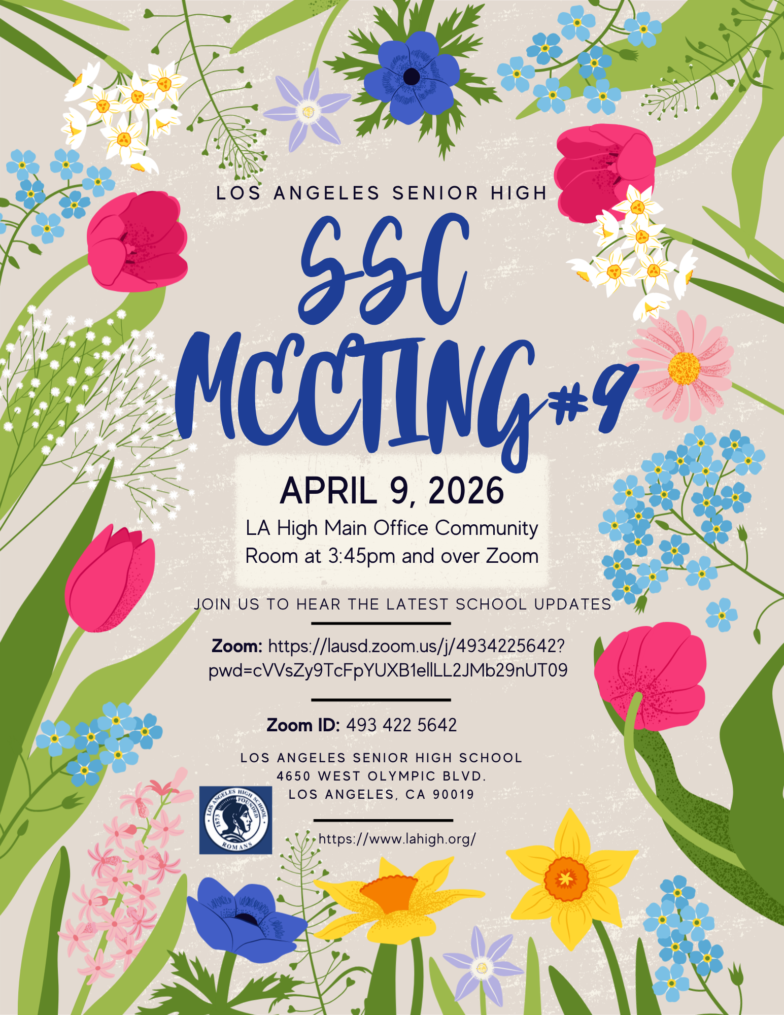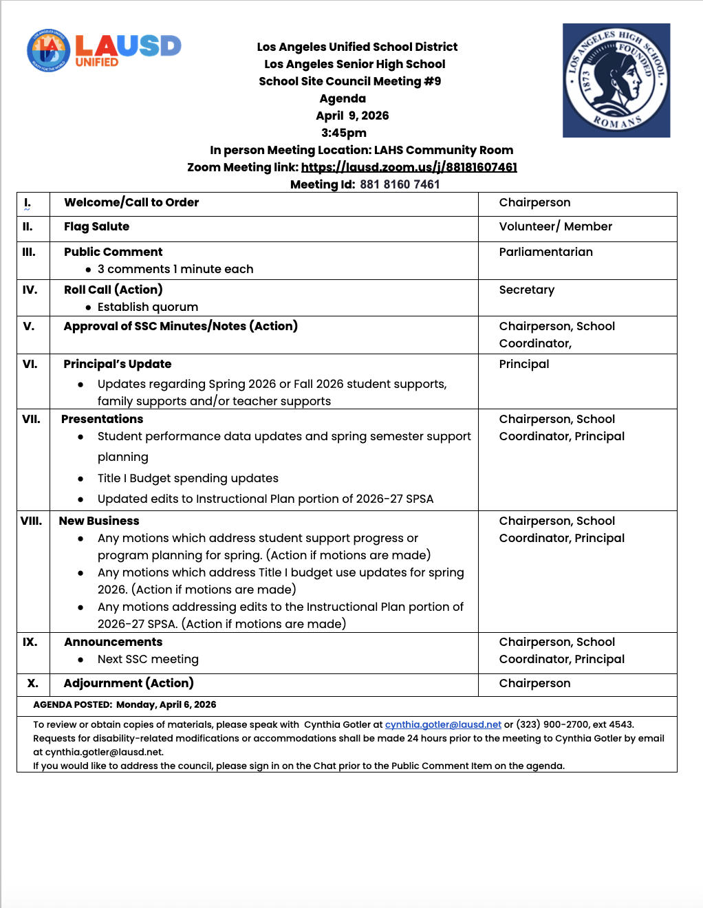 SSC Meeting 04-09-2026 3:45PM @ Community Room and Zoom https://lausd.zoom.us/j/4934225642 Published April 7, 2026 Print